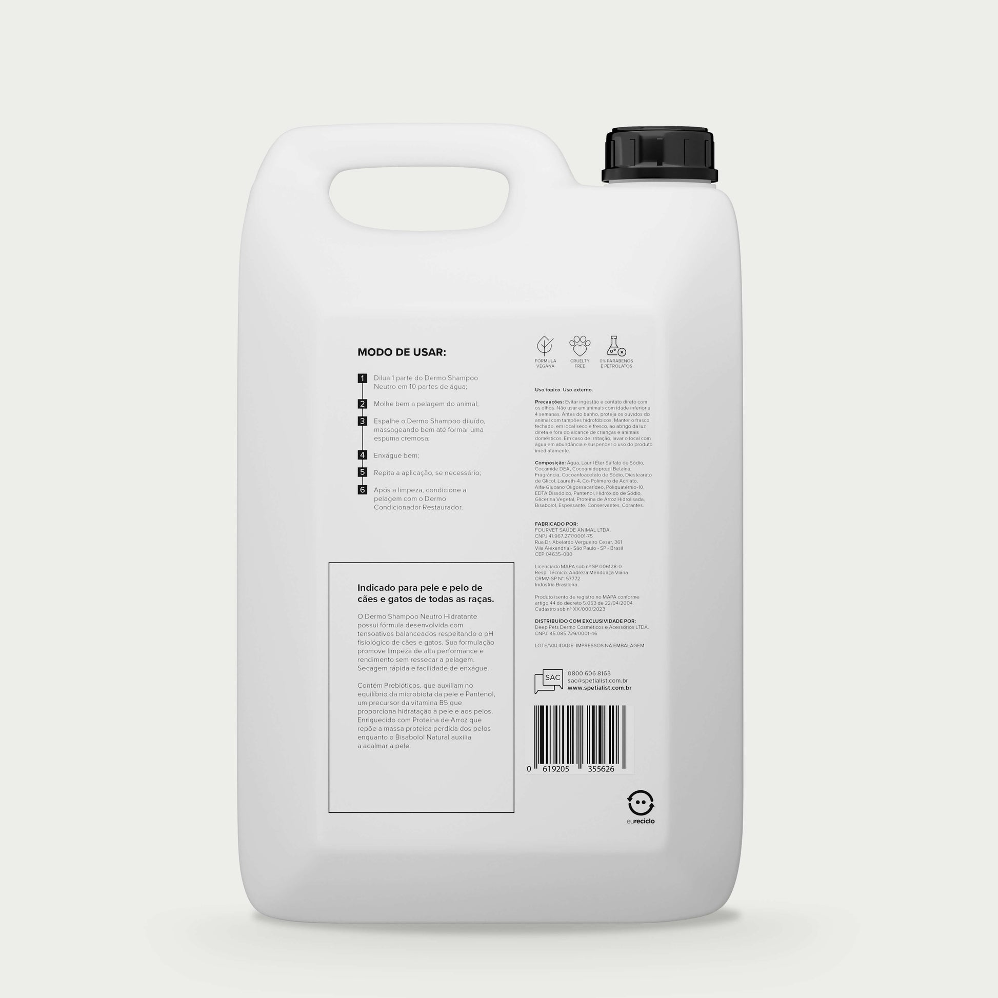 O Dermo Shampoo Neutro Hidratante possui fórmula desenvolvida com tensoativos balanceados respeitando o pH fisiológico de cães e gatos. Sua formulação promove limpeza de alta performance e rendimento sem ressecar a pelagem. Secagem rápida e facilidade de enxágue.
